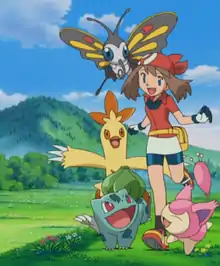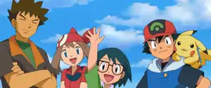 May's Pokémon appear with her. Then, Ash's Pokémon appear with him, and Snorunt/Glalie bounces in front of them. Brock and Max are shown with their own Pokémon, and Ludicolo starts dancing in front of them. Team Rocket then appears on the screen, all in the balloon, except Jessie, who is holding a rose.