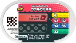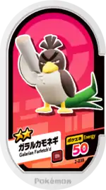 Galarian Farfetch'd (Japanese: ガラルカモネギ Galarian Kamonegi) is a Grade 2 Pokémon Mezastar tag. It is part of the second set.
