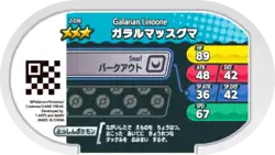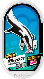 Galarian Linoone (Japanese: ガラルマッスグマ Galarian Massuguma) is a Grade 3 Pokémon Mezastar tag. It is part of the second set.