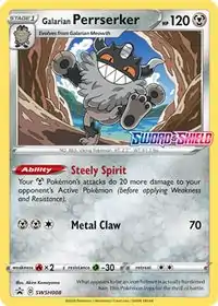 Steely Spirit is an Ability in the Pokémon games that Perrserker can have. Metal Claw is a move in the Pokémon games that Perrserker can learn. This card's Pokédex entry comes from Pokémon Sword. The Rebel Clash and Shining Fates prints feature the Shiny version of Perrserker.