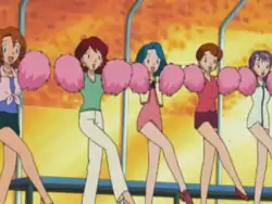 The cheerleaders were then absent for most of the Johto League. They finally reappeared in The Ties that Bind and Can't Beat the Heat!, where they supported Gary as he competed against Ash in a Full Battle round during the Silver Conference. Unlike the previous battles, they did not start crying when Gary lost to Ash.