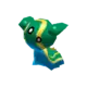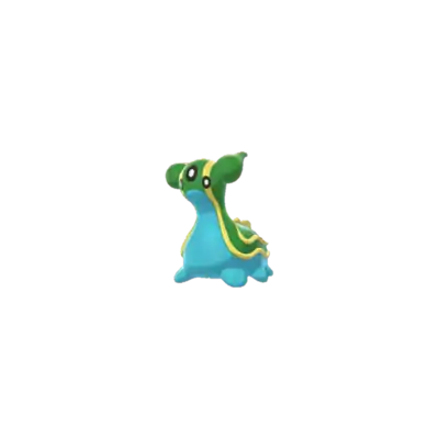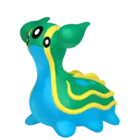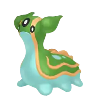 In its East Sea form, it retains the head tentacles it had as a Shellos, which are now fully green and angled slightly more upward. Its underside is blue, while its mantle is green with two blue spots on each side. It has a pair of yellow, fin-like cerata on its back and a wavy yellow line bordering its side and rear.