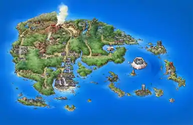 This region's geography is mostly rural on the interior of the continent, with major cities springing up near its ample coasts. Routes between the cities can be treacherous, with densely-forested area covering much of the land. Legendary Pokémon are said to have created the region long ago, with its shape reminiscent of a yin-yang symbol reflecting the balance between land and sea.