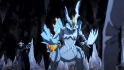 | Kyurem appeared when Ghetsis commanded it to freeze the entire Unova region, but when N and his Reshiram came to stop them, Ghetsis used the DNA Splicers to fuse Kyurem with Reshiram and turn it into White Kyurem. | ||