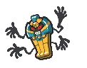 | Cofagrigus is one of the Pokémon Ghetsis used in his battle against Black at N's Castle. Thanks to its Ghost-type, it easily had an advantage over Black's Musha. Eventually, it was defeated by Brav's Sky Drop.