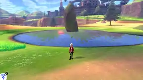 The Giant's Mirror (Japanese: 巨人の鏡池 Giant's Mirror Pool) is a part of the Wild Area in the Galar region, located in the east of the northern portion of the Wild Area. It connects to the Stony Wilderness to its south, Dusty Bowl to its west, and the Hammerlocke Hills to its north.