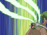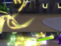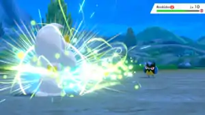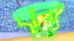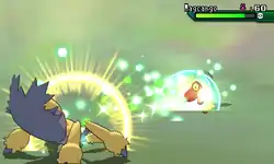 Ninjask flies in circles above the opponent for the entire duration of the attack. Its body glows green, leaving behind a turquoise trail of energy that forms a ring. Once the ring is completed, Ninjask's eyes glow red, and green static from the circle hits the opponent, draining its energy and making its body glow green. | ||