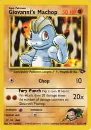 Giovanni's Machop (Japanese: サカキのワンリキー Sakaki's Wanriky) is a Fighting-type Basic Pokémon card. It is part of the Gym Challenge expansion.