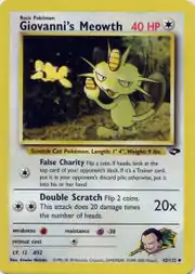 Giovanni's Meowth (Japanese: サカキのニャース Sakaki's Nyarth) is a Colorless-type Basic Pokémon card. It is part of the Gym Challenge expansion.