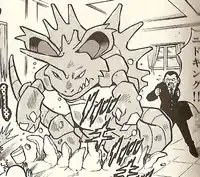 | Giovanni's Nidoking was used in the Gym battle against Red. He was sent out after Rhydon was beaten. Nidoking managed to easily incapacitate Clefairy and surpassed most of Pikachu's attacks. When Clefairy was back in the battle, Nidoking fell for Clefairy's disguise as a Nidoqueen and a chase went on. He reappeared in Good-Bye Pikachu?! when Giovanni had his Pokémon surround Red as he had Dratini.
