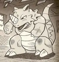 | Giovanni's Rhydon was used in the Gym battle against Red where it battled Clefairy. Clefairy did everything silly to defeat it but only a few of them worked as he got punched away for the unsuccessful ones. Rhydon gave chase to Clefairy with Clefairy narrowly dodging it. It was then defeated after Clefairy tried making it angry and was thrown into the roof.