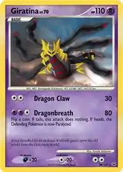 Giratina (Japanese: ギラティナ Giratina) is a Psychic-type Basic Pokémon card. It is part of the Platinum expansion.
