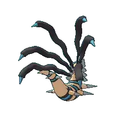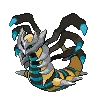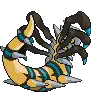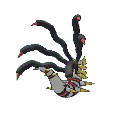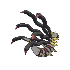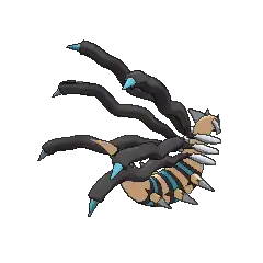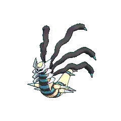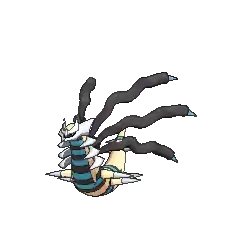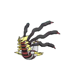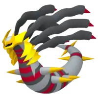 In its Origin Forme, it takes on a serpentine look. Its legs are reduced to golden-tipped spikes, and four additional golden spikes appear near the edge of its tail. While in Origin Forme, the six gold half-rings can grip objects. The back points of each half-ring have a black ghostly tendril with red a spike at its tip. The horns on its head are now facing the back. The sides of the golden "crown" cover its mouth and separate vertically like an insect's mandible when it opens its mouth. The black vertical stripe is broken into pieces and runs all the way down its body. Giratina can only be in its Origin Forme when in its home, the Distortion World, or when holding either a Griseous Orb or Griseous Core. Giratina can also maintain its Origin Forme in real world without items should it get sufficient amount of power, enough to potentially be equal to Arceus. Giratina is at its full power when in the Origin Forme.