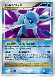 Glaceon (Japanese: グレイシア Glacia) is a Water-type Level-Up Pokémon LV.X card. It is part of the Majestic Dawn expansion.