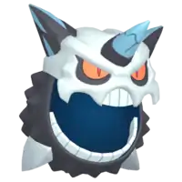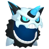 Mega Glalie's jaw is dislocated because of the overwhelming energy, causing its mouth to extend to the length of its face. The lower jaw is all black except for two light-blue, conical, icy spikes. The pupils in Mega Glalie's eyes are now red instead of black. The horns on top Mega Glalie's head have been partially turned into ice, with the addition of a third horn on its forehead.