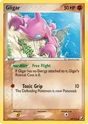 Gligar (Japanese: グライガー Gliger) is a Fighting-type Basic Pokémon card. It is part of the EX Unseen Forces expansion.