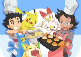 Artwork of Ash and Goh posted for the anime's return Artwork for Happy Sunshine Day in 2020