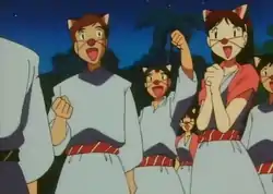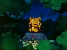 The islanders worship the legendary "Meowth of Bounty", whose arrival on a full white moon night will make them rich with its Pay Day attack. Most villagers wear light blue tunics, cat ears, whiskers, and cat-like noses in honor of the Great Meowth. Mikeosu and elder Shimajio lead the villagers through ceremony and rituals as they await the arrival of the Meowth of Bounty. Their Meowth shrine features a giant golden statue, which is actually a machine that requires people power to operate it as the Meowth of Bounty's personal guard.