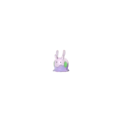 Goomy is a Pokémon that resembles a slug or a slime with beady black eyes. The lower half of its body is light purple, while the upper half is a paler shade of purple. Along the dividing line of the two colors are five large, green spots. The front part of this line is its mouth. On top of its head are two pairs of antenna-like horns; the hind pair is longer than the front pair. These sensitive horns are used to check its surroundings.