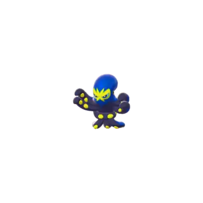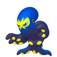 Grapploct is a blue, amphibious, octopus-like Pokémon with a yellow jagged eyemask-like marking, suckers, and what appears to be a breathing organ on the side of its head, which can also be used to squirt out ink and perform special moves. It has a dark blue underside and cyan eyes. Four of its eight tentacles act as arms, three act as legs and one is wrapped round its waist. Its mouth is hidden under the bottom flap of its head.
