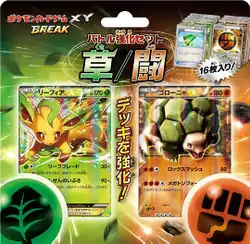 As its name implies, the Grass/Fighting Battle Strength Set features a selection of Grass-type and Fighting-type Pokémon, including focal Pokémon Leafeon and Golem, which appear as Pokémon-EX. The remaining cards of the 16-card set comprise supporting Trainer and Special Energy cards. Unlike the majority of fixed card releases in Japan, the set does not have its own collection number or symbol, with reprinted cards bearing numbers, symbols, and rarity from their source expansions, and new cards printed as XY-P Promotional cards. Each set also comes with a player's guide.
