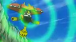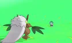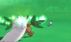 Tapu Bulu creates a dome of green energy that surrounds it and its opponent, or Tapu Bulu rattles the bell on its tail and light-green rings of aura emit from its body, making the area around it glow light-green and powering up Grass-type moves. | ||