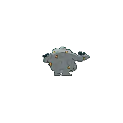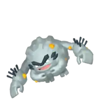In the Alola region, Graveler looks similar to its regular counterpart, but with a silvery sheen. It lacks defined digits on its upper limbs and has two toes on each foot rather than three. There are several small, yellowish crystals scattered across its body and iron sand attracted by magnetism. This black sand creates crystal-like formations above its eyes, across the tops of the upper pair of arms, and on the sides of its face. Alolan Graveler feeds on dravite, which creates the yellow crystals on its body and grants it electrical abilities. It often fights with others over food, and when two smash together, it creates a flash of light and a booming sound; for this reason, people refer to it as "the fireworks of the earth". Similar to its Kantonian counterpart, Alolan Graveler also roll down mountain paths; however, instead of flattening obstacles as it rolls, it sends them flying by zapping them with electricity.