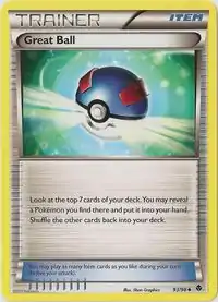 During the XY Series, Great Ball was released with new artwork by Toyste Beach in the XY expansion, first released in the Japanese Xerneas and Yveltal Half Decks. An unnumbered XY-P Promotional print of this artwork was one of five Trainer cards available in conjunction with the Pokémon Card Game Deck Building Seminar event held as part of the Pokémon Center Pokémon Card Game School. This was present at participating Pokémon Centers in Japan from October 25 to November 16, 2014 and was open for elementary school-aged children. A 20-card set comprising two copies each of five Trainer cards plus 10 Energy cards could be purchased at Pokémon Centers during the event for ¥100. It was reprinted again in the BREAKpoint expansion, first released in the Japanese Emboar-EX vs Togekiss-EX Deck Kit.