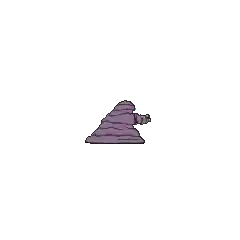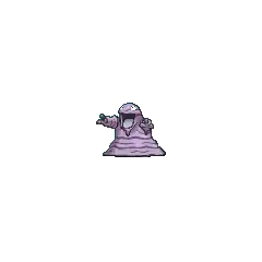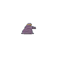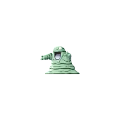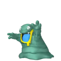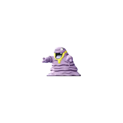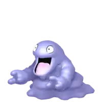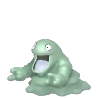 Grimer is a slimy, amorphous Pokémon whose body was animated because of lunar radiation. It has two large eyes with beady pupils and a gaping mouth with a gray tongue. While it lacks any visible legs, it does have two arms with three digits on each hand. Its purple sludge body contains a variety of pungent bacteria, which are so potent that it renders soil barren and incapable of supporting plant life. It is constantly oozing a bacteria-rich fluid from all parts of its body. Pieces of it often break off during travel and go on to become new Grimer. When combined with another Grimer, it produces new poisonous compounds.