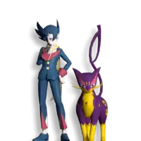 Grimsley's design is based on his appearance in Pokémon Black, White, Black 2, and White 2. Liepard is one of Grimsley's main Pokémon in the core series games. Liepard's Dex entry comes from Pokémon Black 2 and White 2.