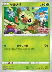 Grookey (Japanese: サルノリ Sarunori) is a Grass-type Basic Pokémon card. It is one of the SWSH Black Star Promos.