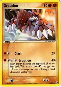 Groudon (Japanese: グラードン Groudon) is a Fighting-type Basic Pokémon card. It was first released as part of the EX Emerald expansion.