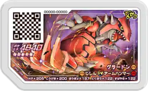 Groudon (Japanese: グラードン Groudon) is a Grade 5 Pokémon Ga-Olé disk. It is part of the second Grand Rush set.