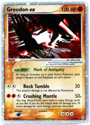 Groudon ex (Japanese: グラードン ex Groudon ex) is a Fighting-type Basic Pokémon-ex card. It is part of the EX Hidden Legends expansion.