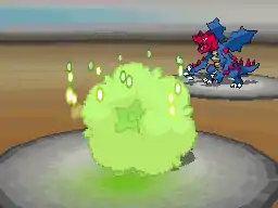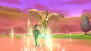 The purple stem on Cherrim's head glows light green and it releases a light green beam from the stem at the target, giving its energy to it. | ||