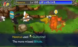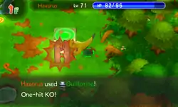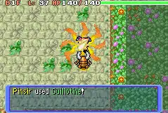 In Red Rescue Team and Blue Rescue Team, Guillotine has 12PP and 35% accuracy. The user attacks enemy in front and makes them faint through "calamitous damage" (internally treated as 9999 damage), regardless of the level. Although most damaging moves can damage a Pokémon immune to the move in main series, Guillotine will always fail if the target has the type immunity.