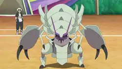 | Golisopod is Guzma's first known Pokémon. It was first used to battle Ash's Pikachu, but the match ended prematurely when Golisopod returned to its Poké Ball due to Emergency Exit. It was used again in The Road to The Semifinals! during the second round of the Alola League, where it emerged victorious against Lana's Primarina.