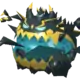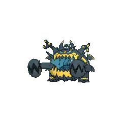 Guzzlord's body is supported by a pair of thick legs, which have yellow zigzag markings across the knees and three claws each. On top of its body is a small, conical head with a second, smaller pair of glowing blue eyes. Four short horns with yellow tips form a ring around its head. On either side of its head is a larger, slightly curved horn also tipped in yellow. There is also a pair of arms on top of its body. Each arm has a hand with three yellow claws. A row of small spikes trails down its back and along its tail. The tail itself extends from the center of its back and resembles a medieval mace.