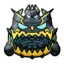Guzzlord is a massive, black Ultra Beast. Its main body is primarily spherical with a large, yellow mouth in the center. The top and bottom of the mouth are lined with two rows of teeth; the front row is yellow, while the rear row is black. In the second row of the upper jaw, two teeth curve out of the mouth similar to tusks. The inside of its mouth is a bright blue and its throat is lined with small spikes; its large black tongue is also lined with small spikes. Additional tongues resembling long arms with pincers protrude from its lower jaw even when its mouth is closed. Just above its mouth are two glowing, blue eyes with a yellow, diamond-shaped marking between them. Above each eye is a single, bat-like wing with yellow along the upper edge. There are other small bat-like wings down the sides of its body as well. On the underside of its body are three, fin-like projections that curve up towards its mouth.
