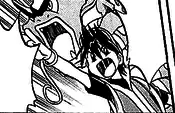 In Holy Moltres, Red faced against the Legendary bird Moltres, which was under the control of Team Rocket. Despite the type advantage Gyara was unable to defeat the Flame Pokémon, and Blaine realized that to stand a chance against the Flying-type Pokémon, they needed a Flying-type of their own. When seeing Red's Old Amber, Blaine sent him to the Island's laboratory, with Gyara staying behind to stall Moltres. Blaine and Gyara were soon overwhelmed, but were saved when Red arrived with Aero.