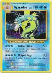 Bubble Beam and Dragon Rage are both moves in the Pokémon games that Gyarados can learn, the former only in Generation I via TM11. This card's Pokédex entry comes from Pokémon Red and Green and Pokémon FireRed. This card is based on Base Set Gyarados.