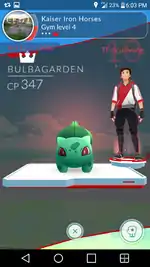 If the player is on a team, they can view the Gym screen, which shows the location's name and photo in the top-left corner and any Pokémon defending it. When a defending Pokémon is selected, the following information will be displayed: