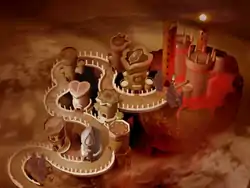 The Gym Leader Castle in Pokémon Stadium is a darkened, curving path leading from tower to tower, with each tower's top in the shape of that Gym Leader's Badge. To advance to the next tower, the player needs to defeat each of Kanto's Gym Leaders in turn, eventually making way to the Elite Four and Champion, the rival. After defeating the rival, the player will win one rare Pokémon out of a selection of eight.