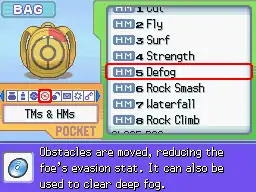 - In Diamond, Pearl, and Platinum, HM05 has the item sprite of a Water-type HM, even though Defog is a Flying-type move. It is possible that a Water-type HM was considered for the position before Defog was finalized. Whirlpool, a Water-type move itself, takes the spot in HeartGold and SoulSilver, though this is likely unrelated, as HeartGold and SoulSilver came out more than three years after Diamond and Pearl were released.