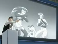 Jessie deduces it is a trick to make them let their guard down, and Team Rocket promptly destroys the smaller mechas before attacking the main mecha. Already heavily damaged, it runs for the mansion, and Team Rocket pursues it inside. There, they are confronted by the man in the mansion, who introduces himself as Professor Brown, a scientist specializing in mechas, which he builds for various purposes. James asks why he has been using the mechas to terrorize the village; Brown explains that he just wanted to make friends with the villagers, but since he was really shy, he instead sent a useful mecha as a present. It was meant to take over farming duties, but the villagers thought it was attacking. Jessie then realizes they could hire Brown to build a mecha army for them as part of Team Rocket's Hoenn base.