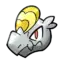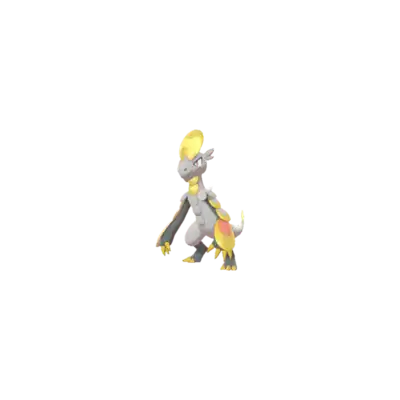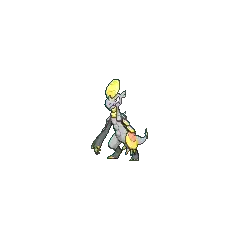 This Pokémon has many scale plates on its body as well. There is a yellow one on its forehead, which is oval with a light yellow, heart-shaped stripe across the middle. Two circular scales cover the front of its neck; both are light yellow with darker edges. The tops of its arms are covered by three overlapping scales. The first two arm scales are gray with yellow trim, but the last scale is red with yellow trim and much larger. At the tip of its tail is a small, circular scale. This last scale has a light yellow portion before ending in a darker yellow.