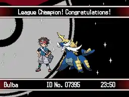 In addition, the player's name, Trainer ID number, playing time and sprite and the message League Champion! Congratulations! are displayed during the ending scene, along with each team member's unique record beforehand.