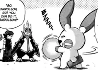 In Canalave City, Minun was used to fight Saturn but was easily defeated by his Magmortar and ran away. When Saturn had Magmortar attack Minun, Hareta's Empoleon stepped in to protect it from the flames. Annoyed at Minun's cheering Empoleon on, Saturn ran up and grabbed Minun. Minun responded by shocking Saturn and paralyzing him, allowing Hareta to defeat Saturn's Pokémon and win the battle.