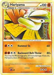 The second attack's Japanese name is harimanage, literally "backward belt throw." It is a sacrifice technique used in Sumo where the attacker throws their opponent behind them by reaching over the opponent's shoulder to grab their mawashi, and then pull them past their own body while twisting into them. This card's Pokédex entry comes from Pokémon HeartGold and SoulSilver.