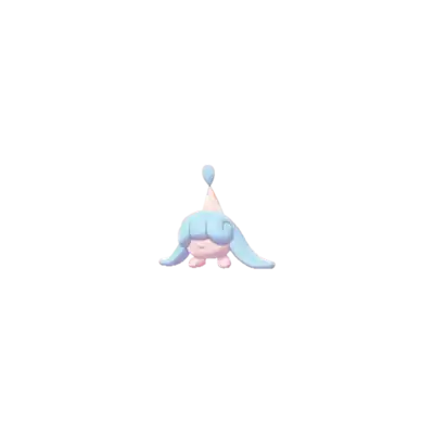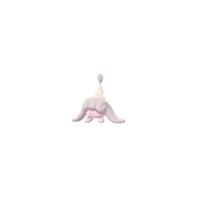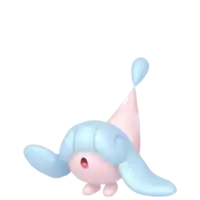 Hatenna is a small Pokémon with a round pink body and a pair of small feet. Most of its body is covered by a blue wig-like feature with a pink, hat-like protrusion on top. This protrusion is decorated with a white spot and has a blue bulbous growth on its tip. The flaps on the side of its head appear to be able to function like limbs.